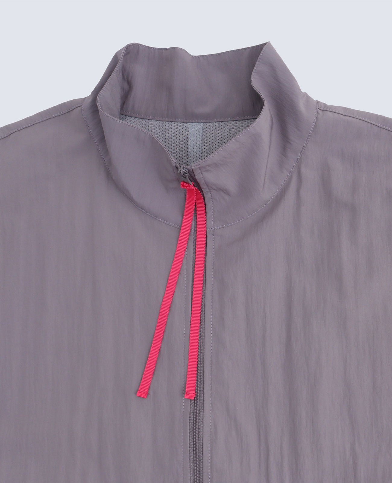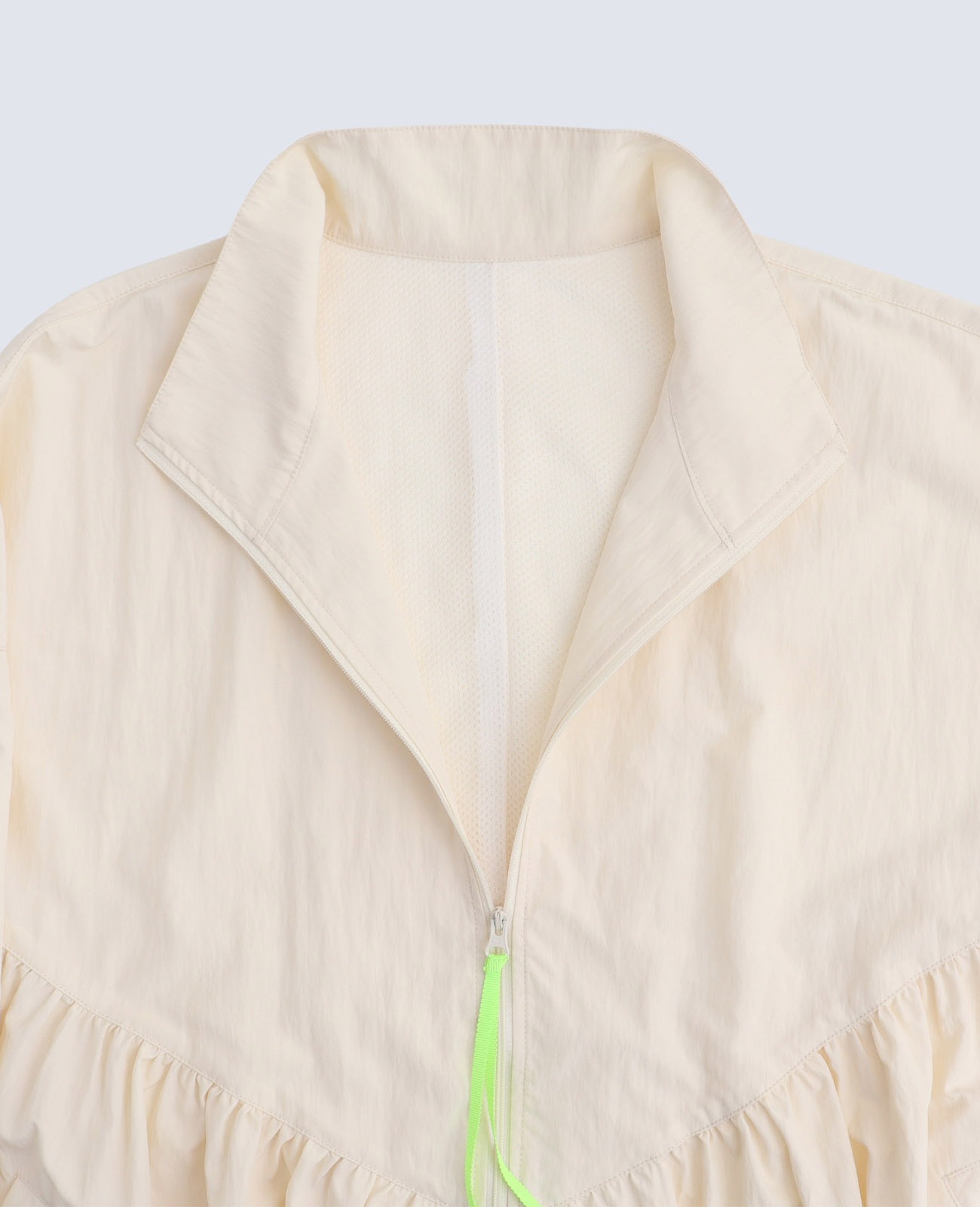 首回りはスタンドカラーで締めることで裾へのテントラインが綺麗に見えます。