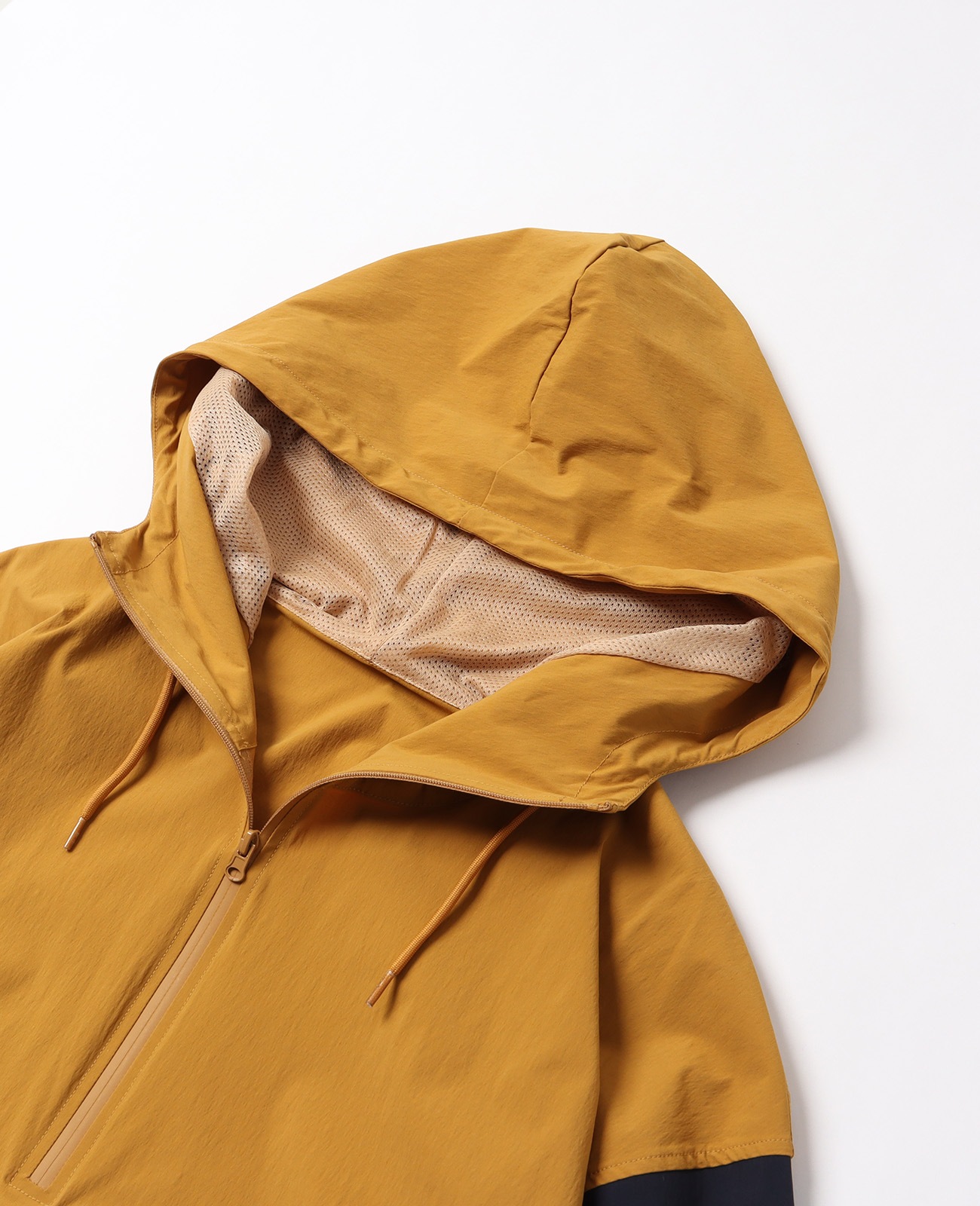 袖裏とフードにはメッシュの裏地を採用し、滑りをよくしています。