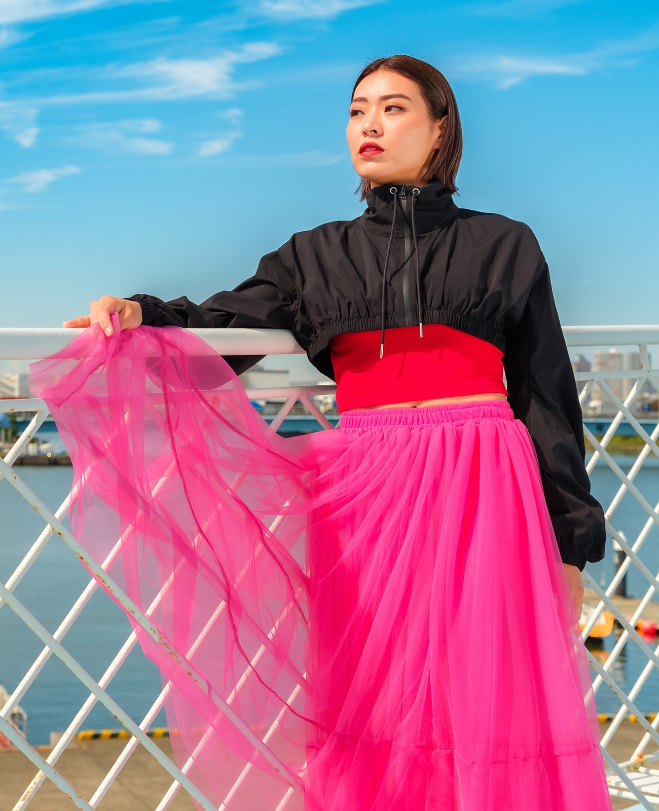 インナーを出した大胆な合わせで個性を主張できるアイテムです。