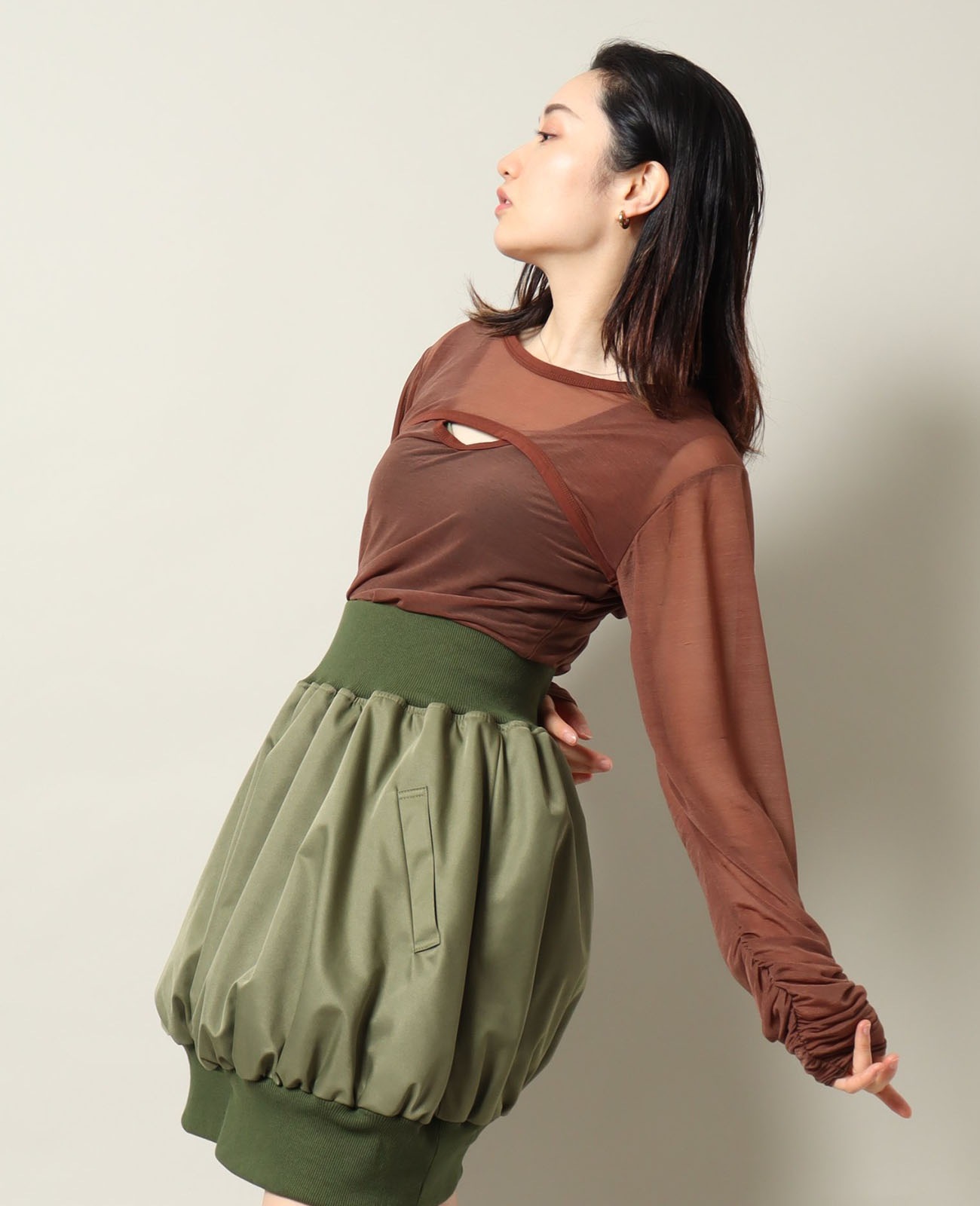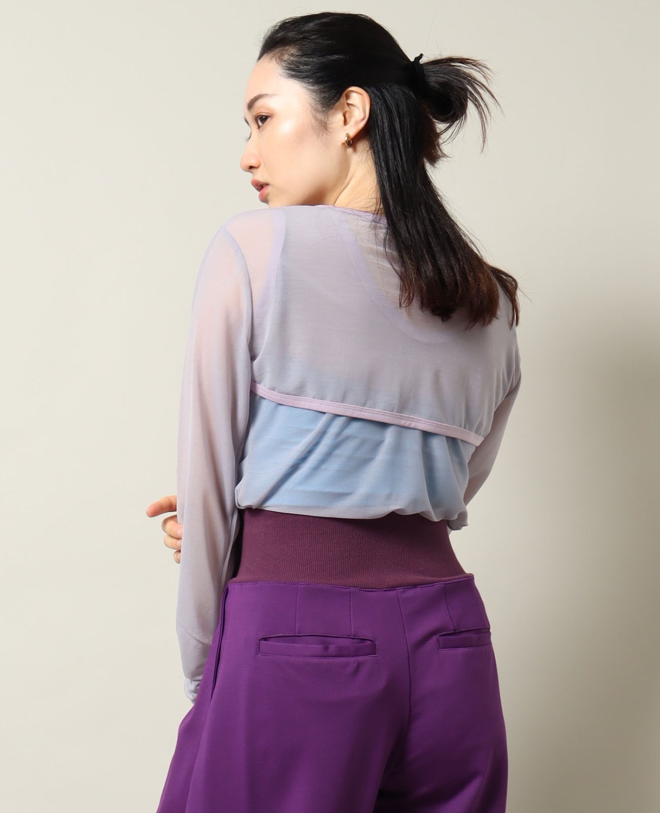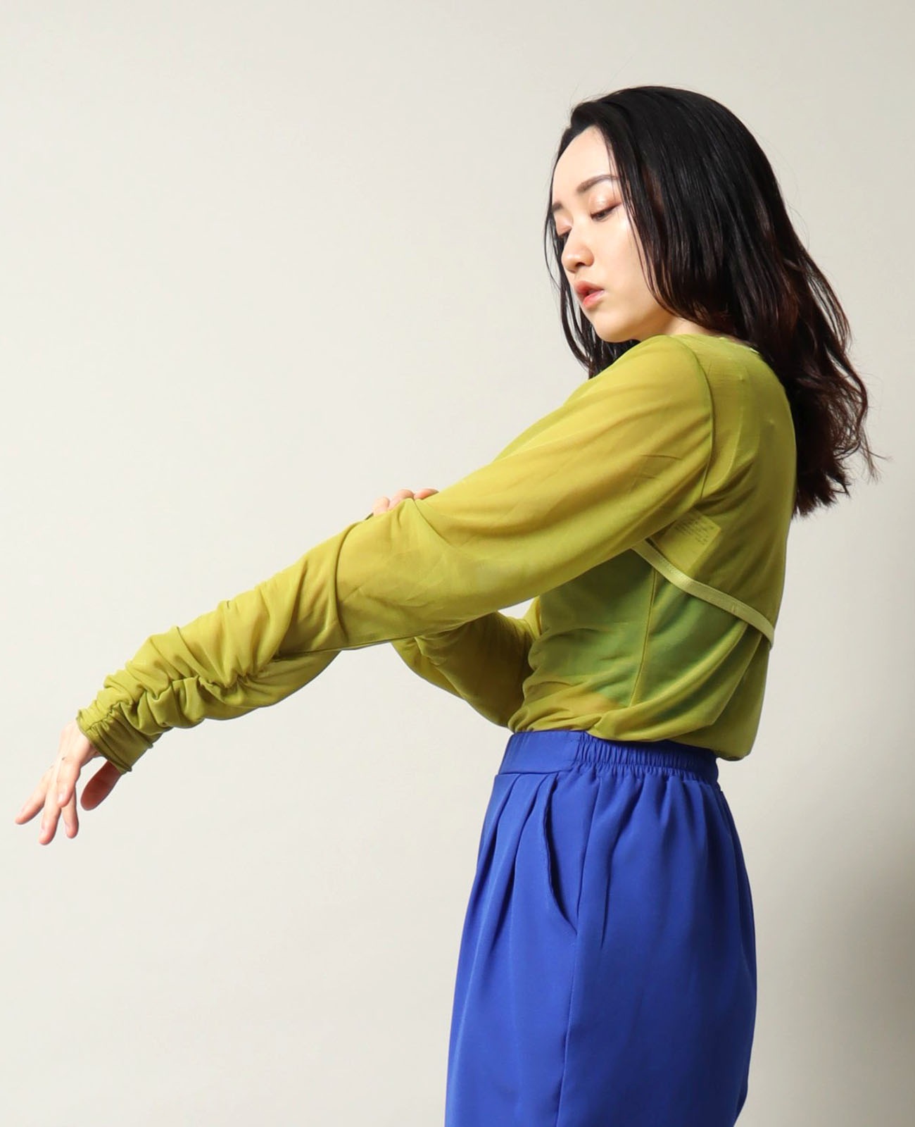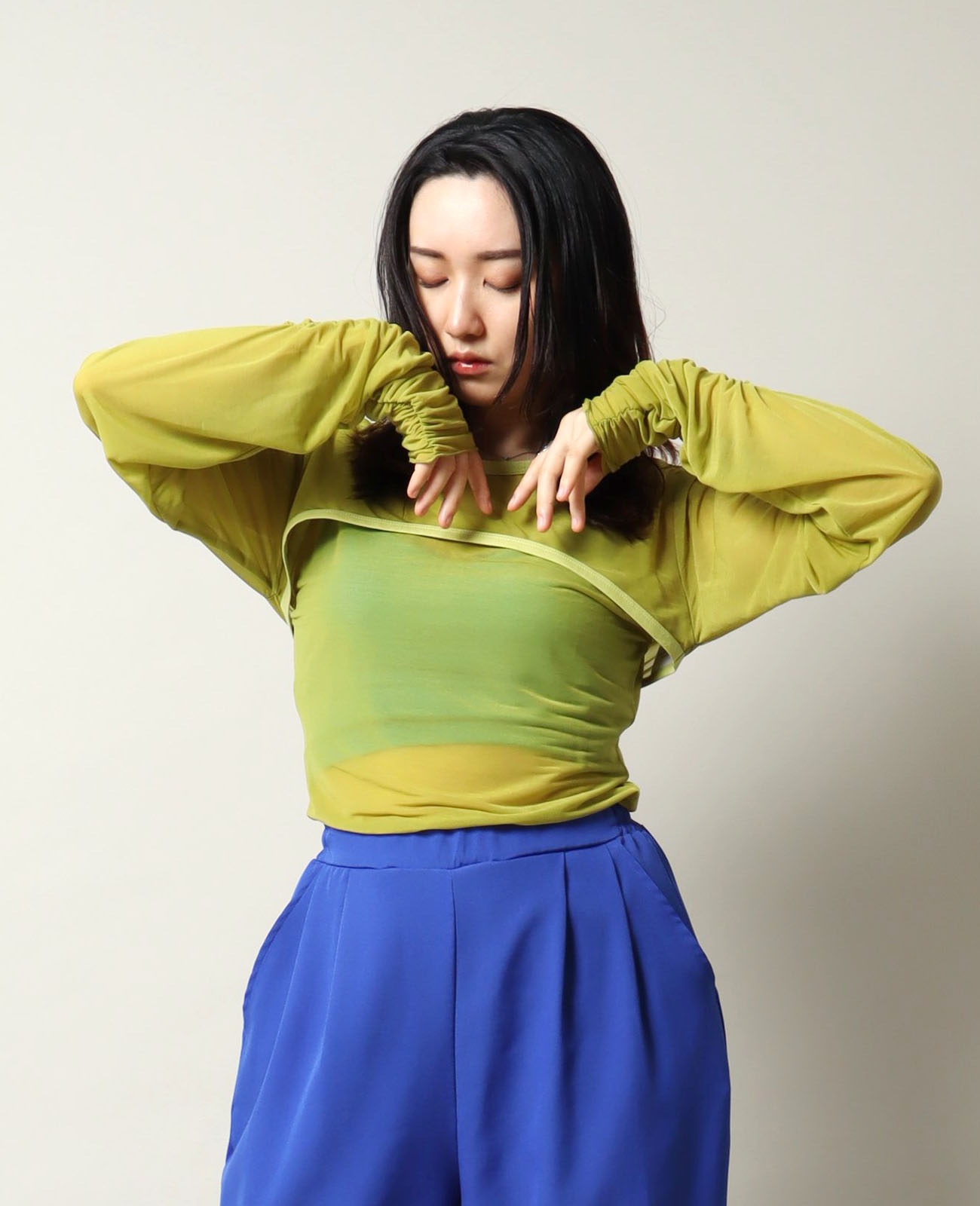 ボレロ感覚で羽織れるクロップド丈の長袖と、2WAY仕様のタンクトップをセットにしたプレイフルなアンサンブル。