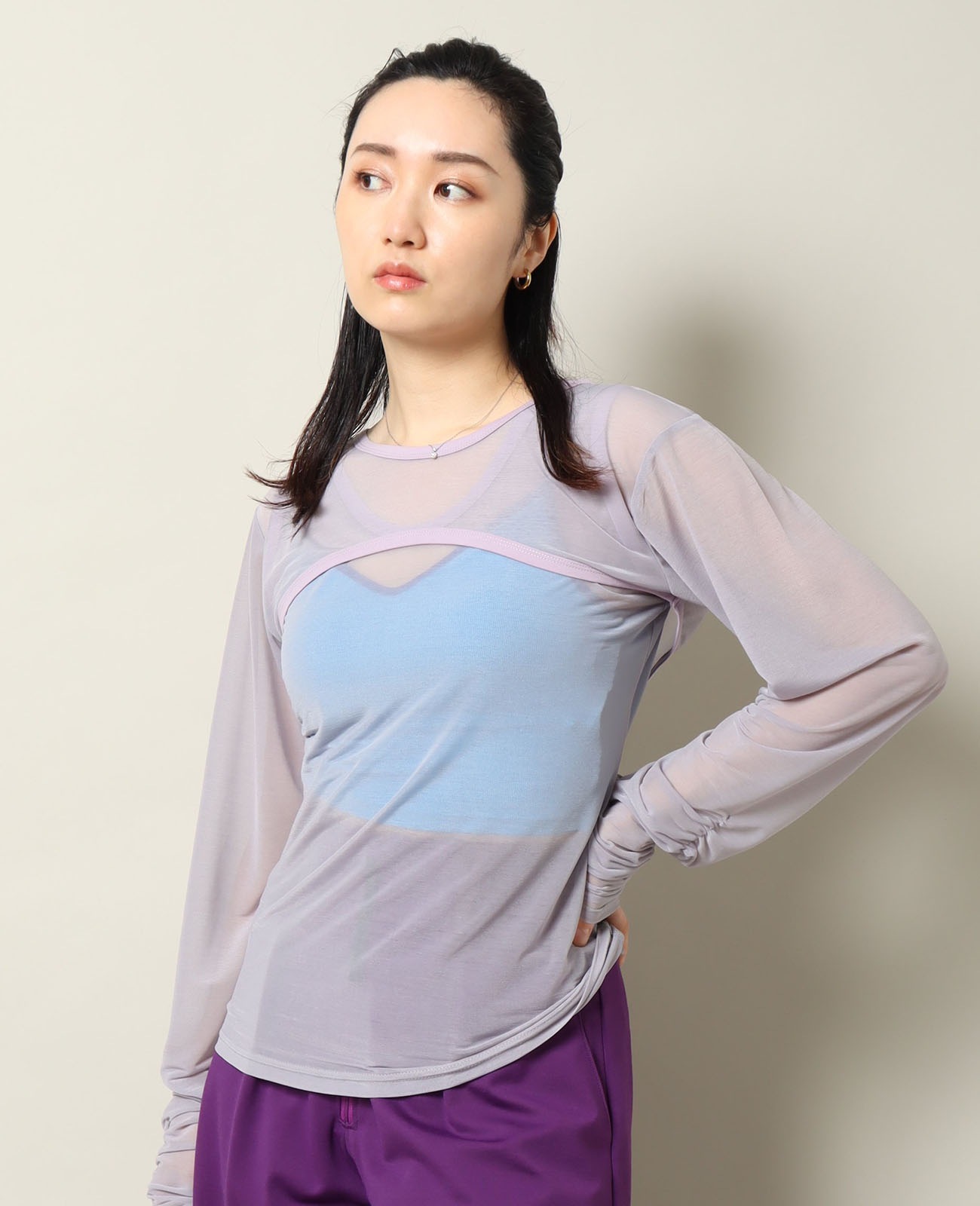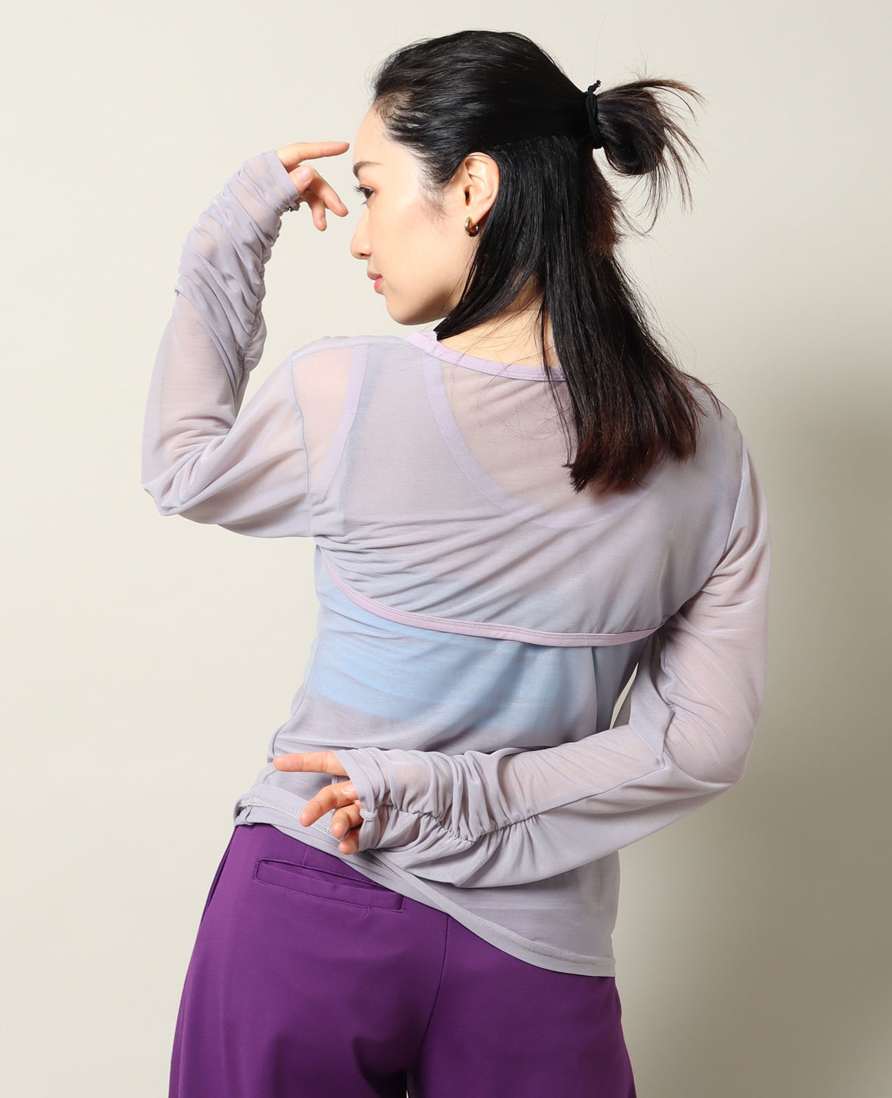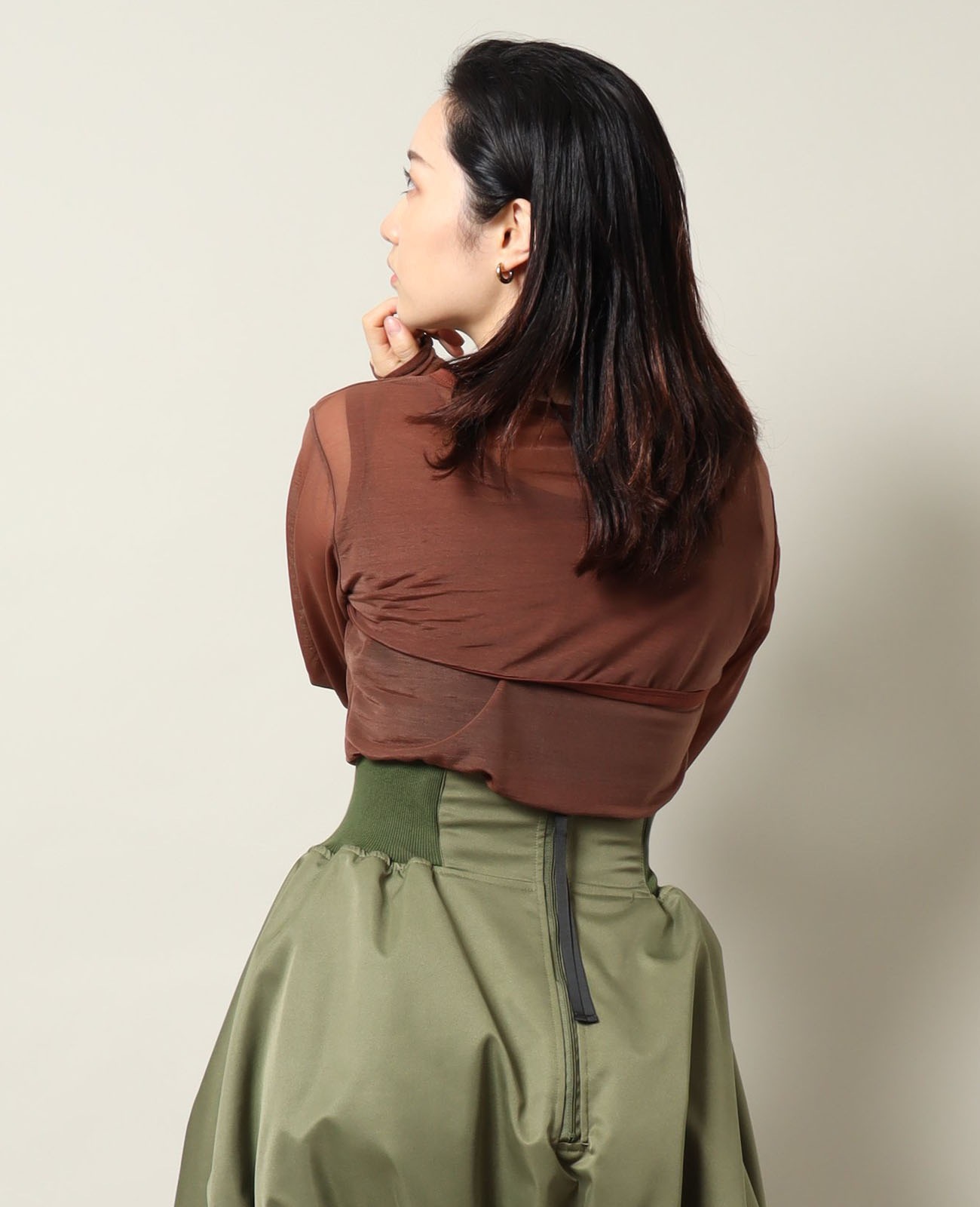ボレロ感覚で羽織れるクロップド丈の長袖と、2WAY仕様のタンクトップをセットにしたプレイフルなアンサンブル。