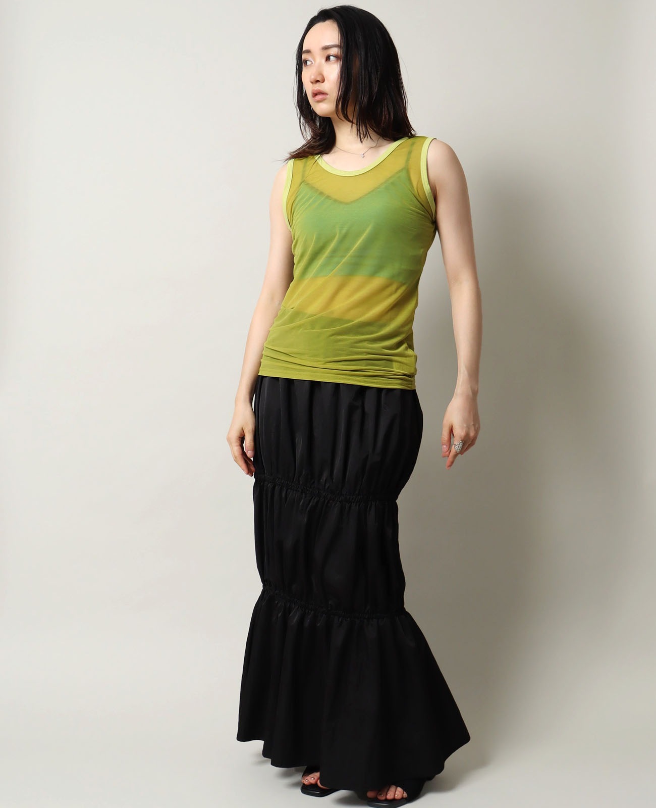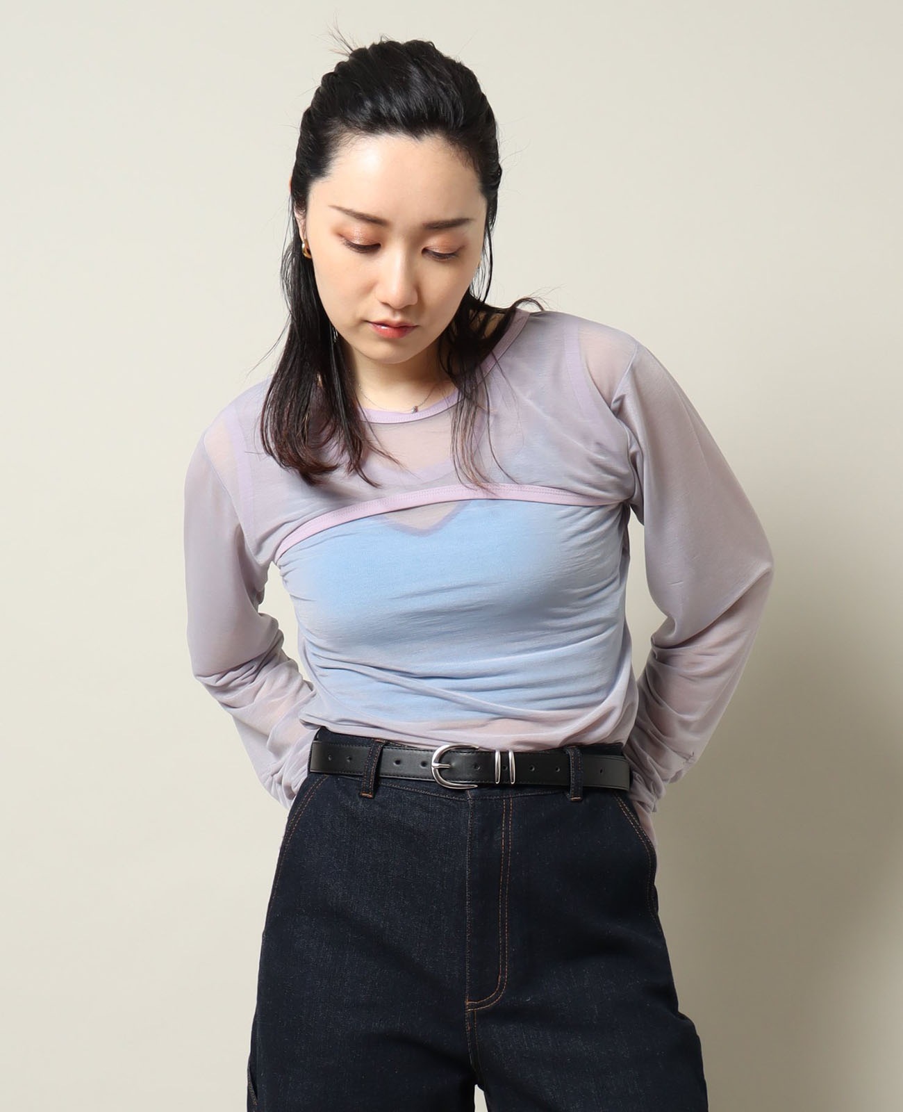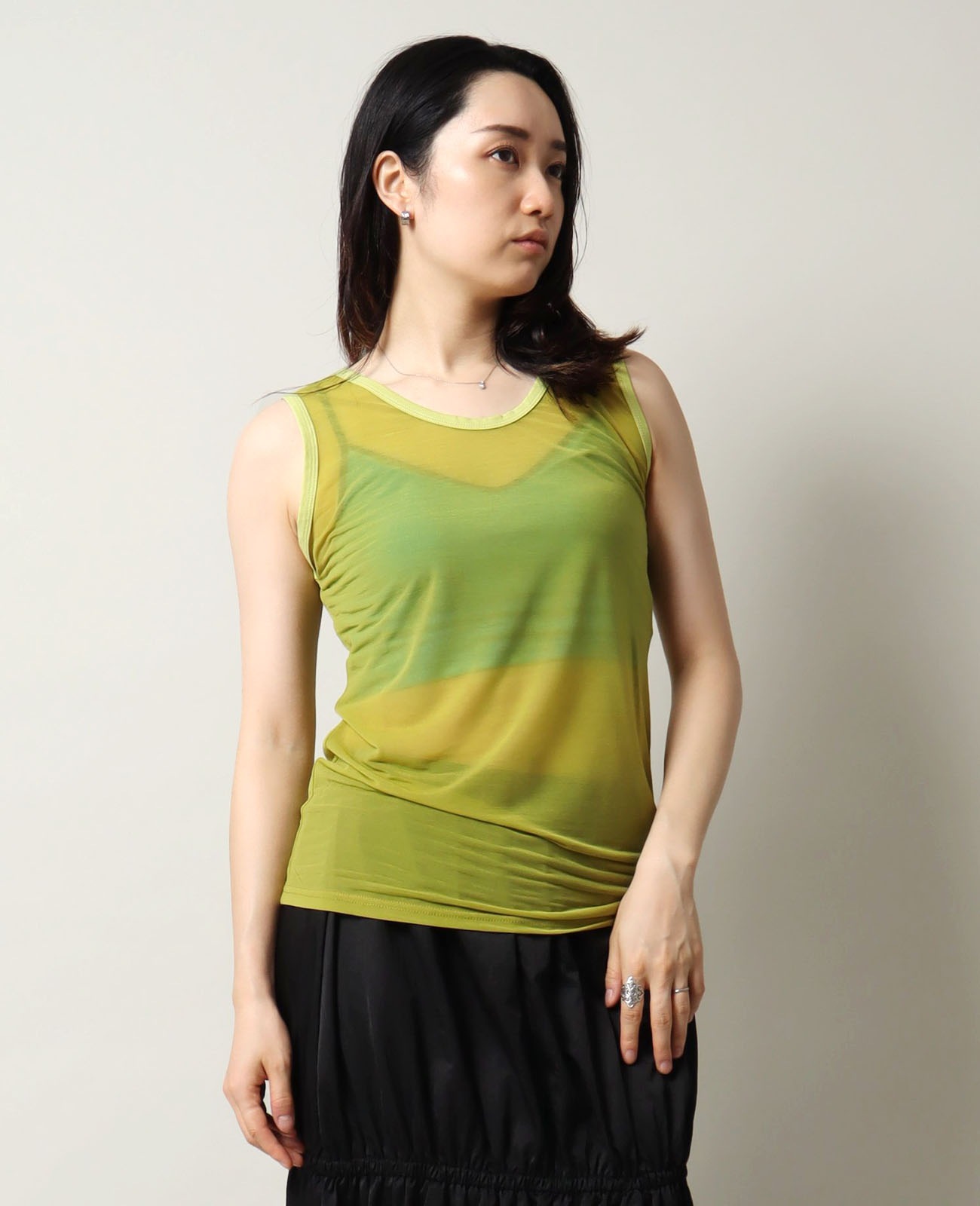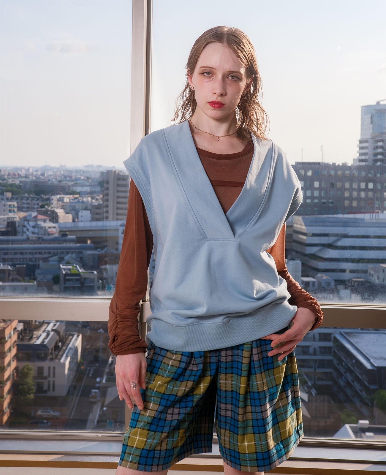 タンクトップは前後でネックの深さが違う2WAYタイプ。気分やインナーに合わせて、自由なレイヤードを楽しんで。
