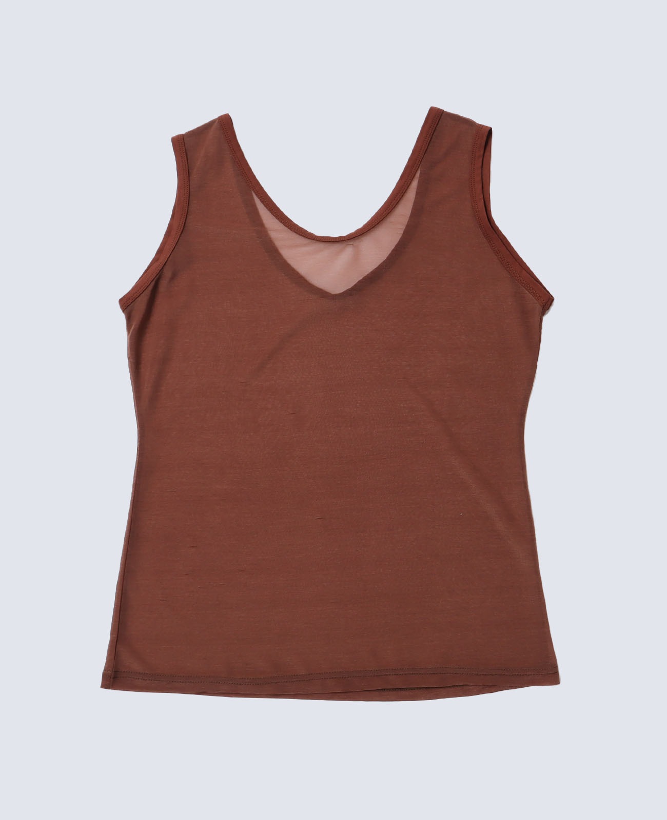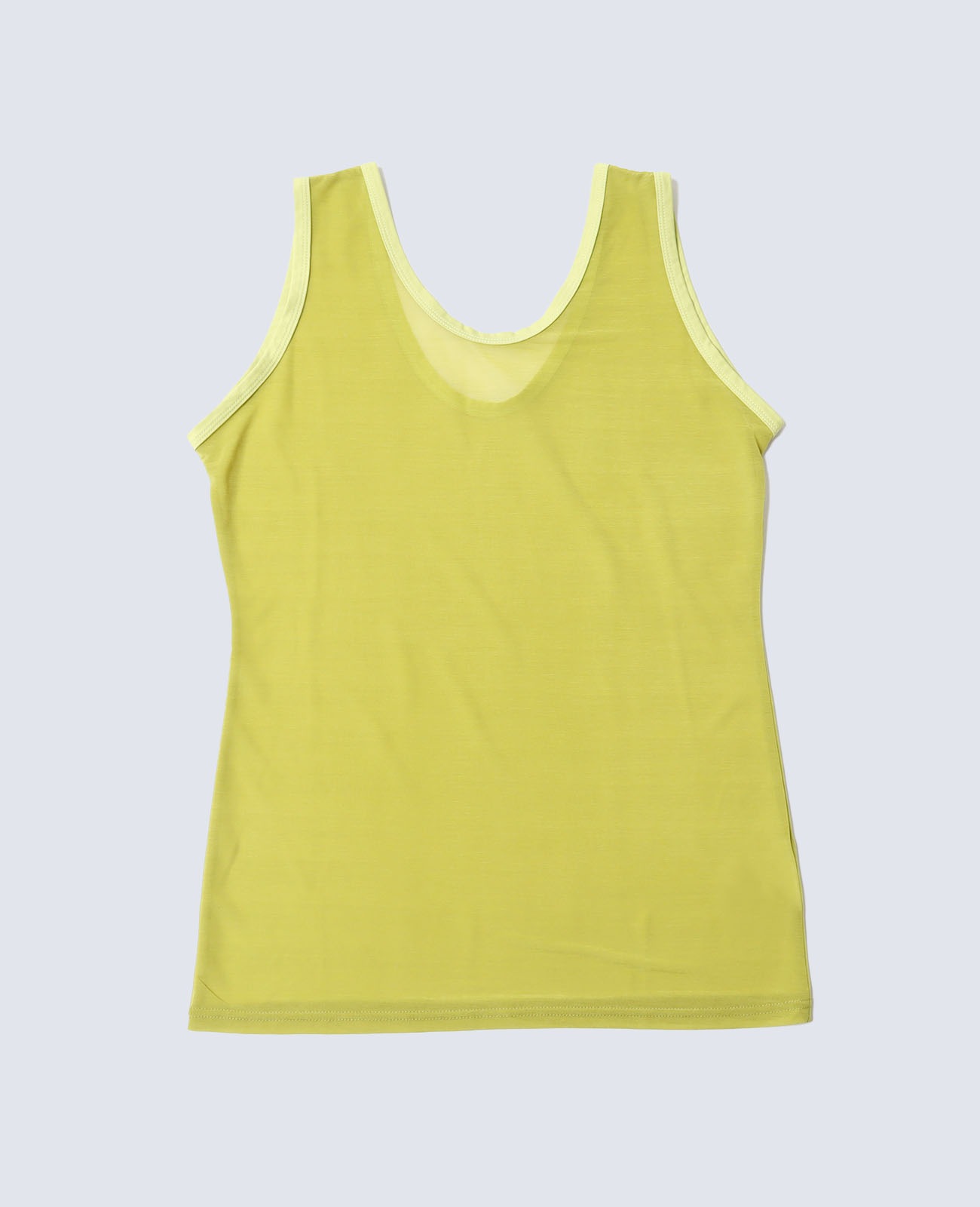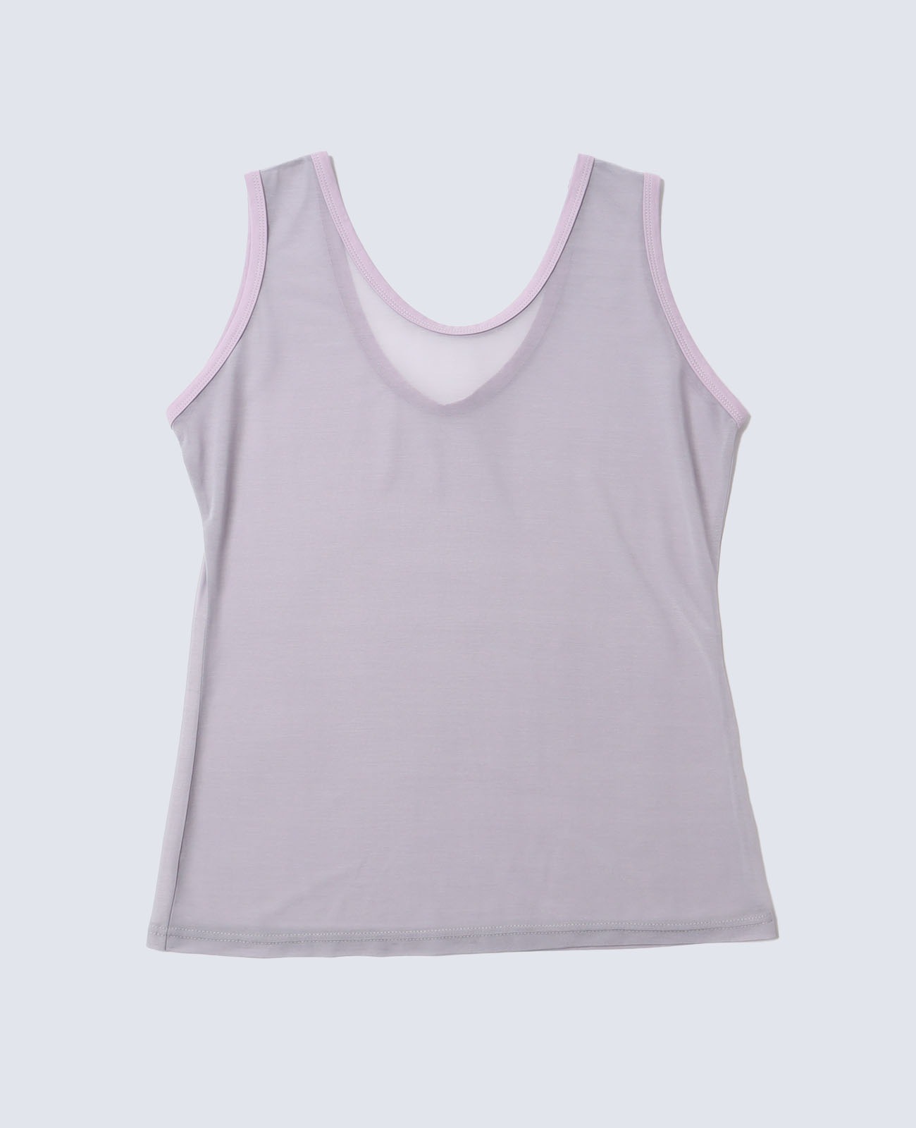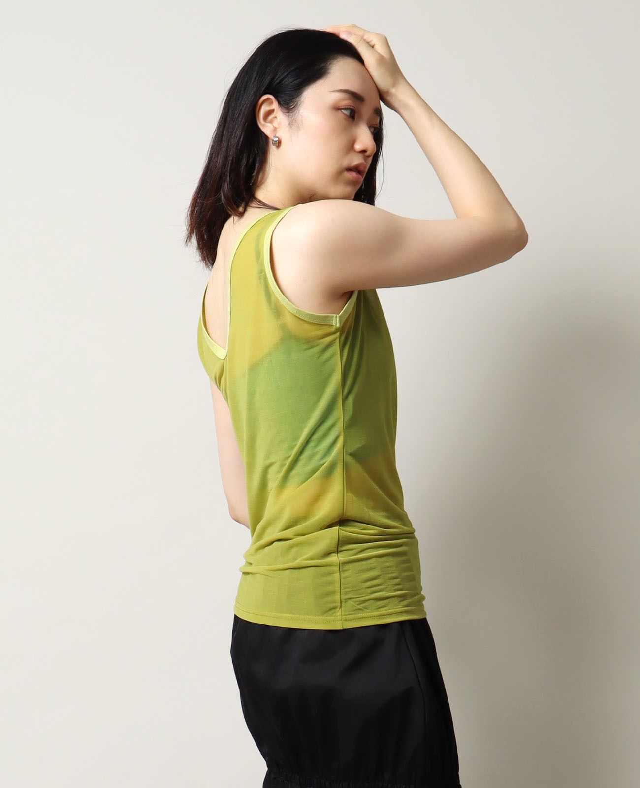タンクトップは前後でネックの深さが違う2WAYタイプ。気分やインナーに合わせて、自由なレイヤードを楽しんで。